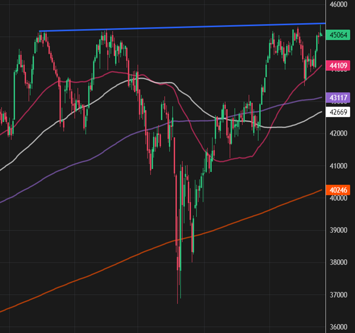 - Failure to beat 45400/45450 risks a slide to 45070 (would you believe this was the exact low after the test of the trend line) & even 44800/750 is possible.