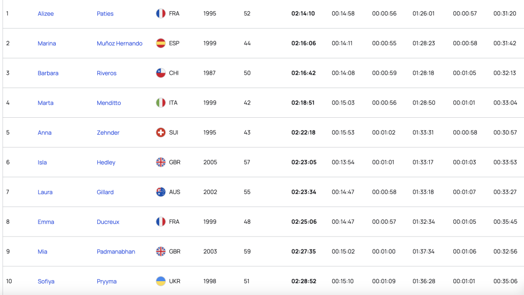 In the women’s race, Alizée Paties delivered a commanding performance to take gold in 2:14:10. Spain’s Marina Muñoz Hernando claimed silver with a time of 2:16:06, while Chile’s Bárbara Riveros secured bronze in 2:16:42. Paties’ dominant effort left no doubt about her supremacy on the day, further solidifying her status as a force in cross triathlon.