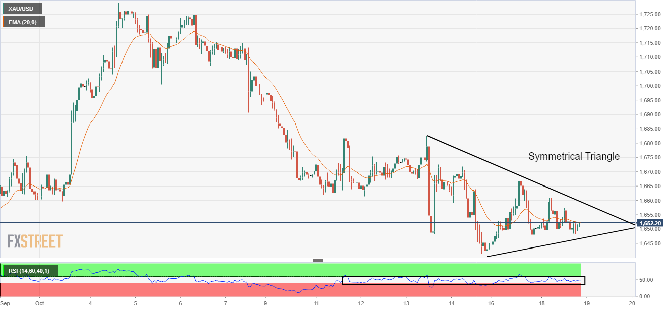 Gold price (XAU/USD) is displaying back-and-forth moves after defending the downside bias below the critical support of $1,650.00. The precious metal is oscillating in a narrow range of $1,645.91-1,657.33 range in early Tokyo. Firmer risk-on sentiment in the market has failed to underpin the yellow metal.