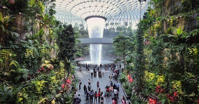 The Jewel Changi Airport in Singapore is worth spending time in during a layover with its forest gardens, seven-story indoor waterfall, rock wall and hedge maze.