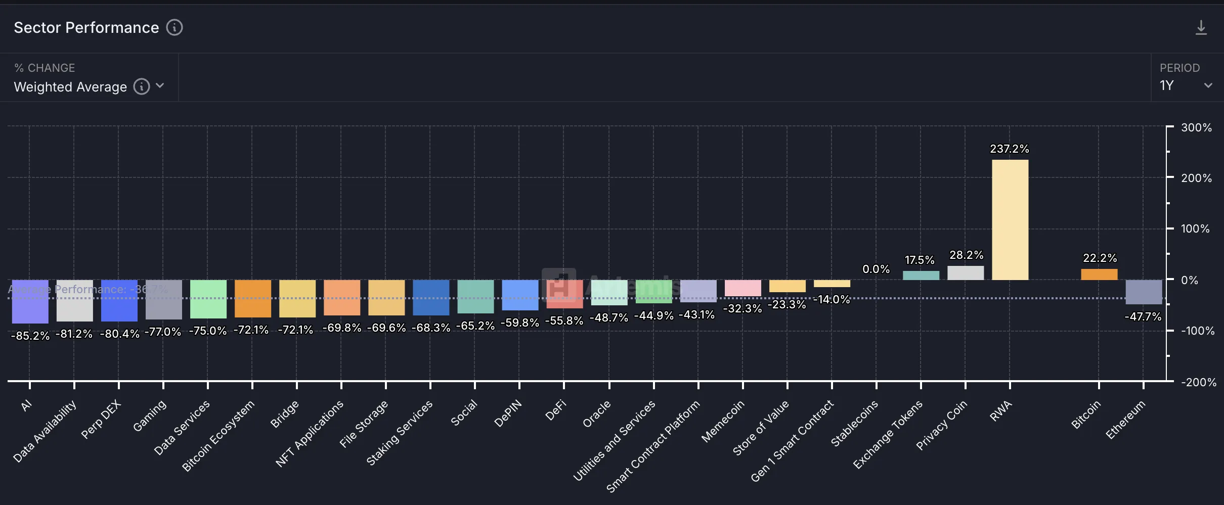 In contrast, the broader crypto market has experienced mixed results, with some sectors suffering deep losses. While Bitcoin (BTC) has gained 22.2% and privacy coins have risen by 28.2%, their growth pales in comparison to the explosive rise of real-world assets. Meanwhile, Ethereum (ETH) has dropped by 47.7%, and the decentralized finance (DeFi) sector has struggled even more with a 55.8% decline.