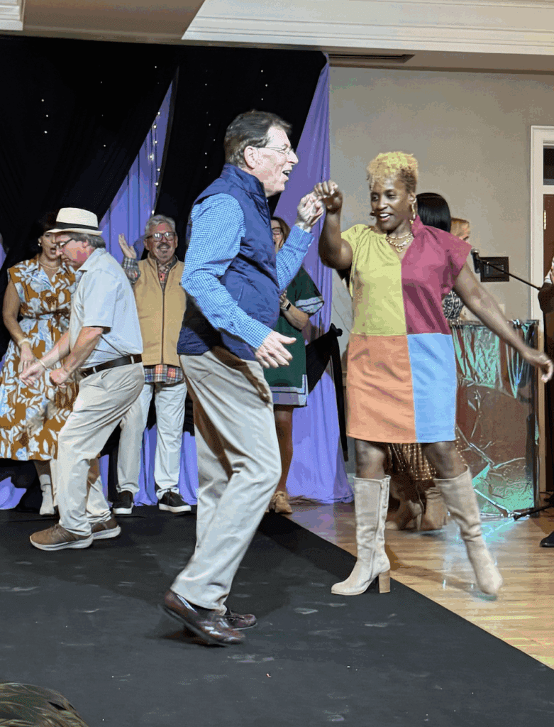 Backstage, I adopted a nonchalant attitude, as is the custom when hanging out with fellow models. I changed into my dressy, Peter Millar outfit, but donned my own leather-soled loafers for my final performance. With ZZ Top stating the obvious, “Women go crazy for a sharp-dressed man,” I walked on stage and dispensed with merely strutting down a runway. It was time to dance.