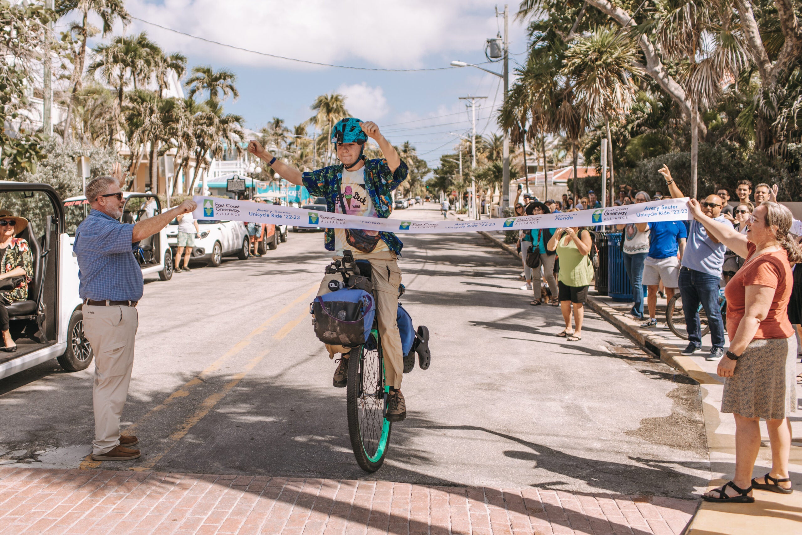 When the unicyclist crossed the finish line in Key West, his parents and grandmother, along with many spectators, were there to congratulate him.